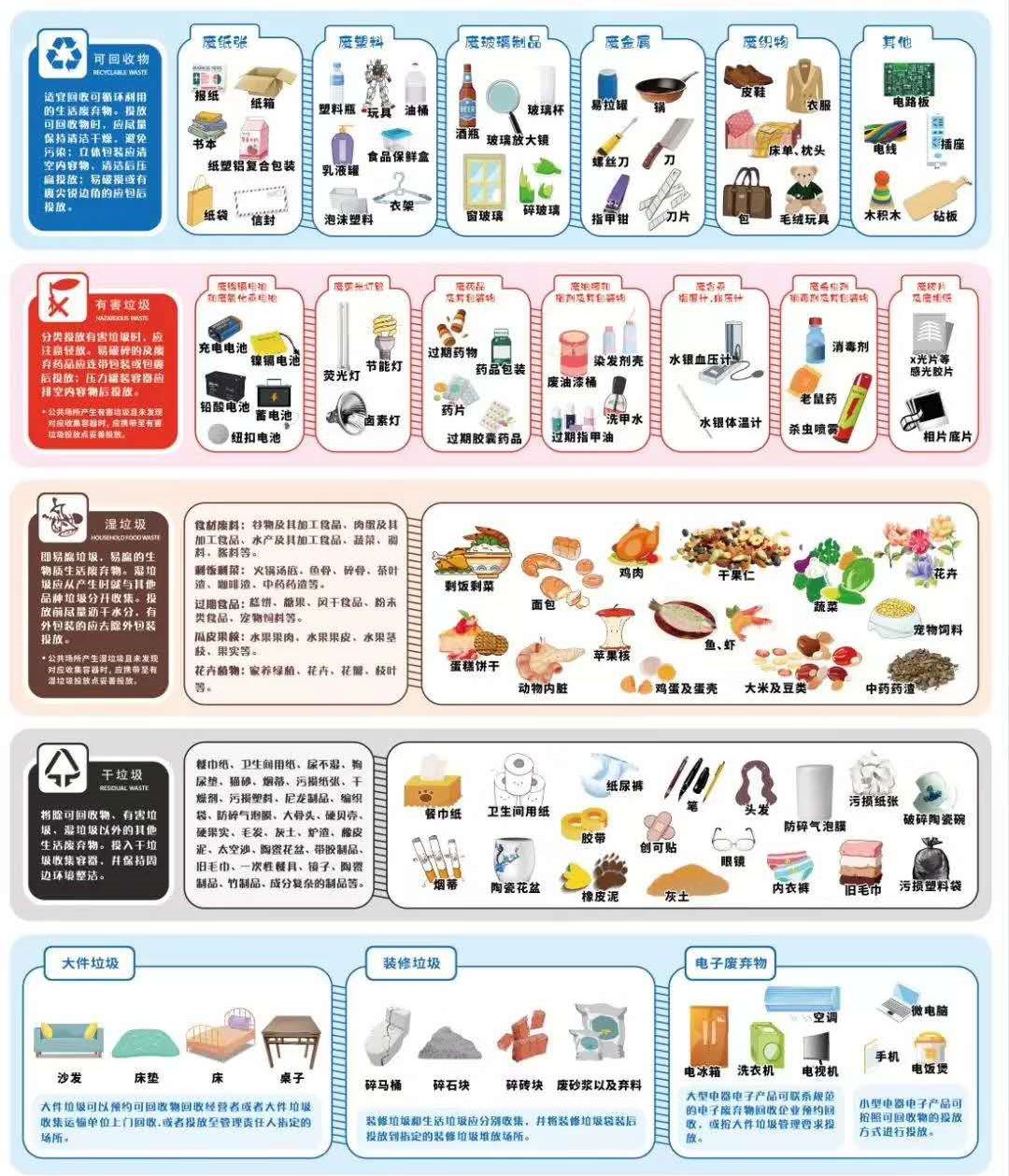 为了便于回收利用和处理,将生活垃圾分为可回收垃圾、干垃圾、湿垃圾和有害垃圾四大类。
