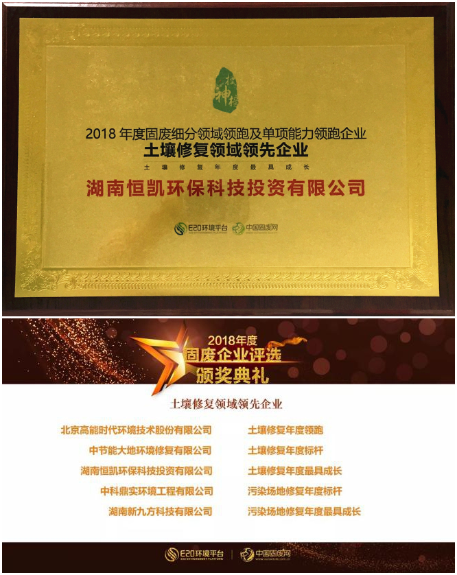 近日,由E20环境平台和中国城市建设研究院有限公司共同主办的“2018(第十二届)固废战略论坛”在北京举行,论坛揭晓了“2018年度(第十届)固废企业评选”结果,恒凯环保继2017年后,再次获得“土壤修复领域领先企业”荣誉称号,公司总裁蒋卫山和总工程师罗文连受邀参加了此次颁奖典礼。