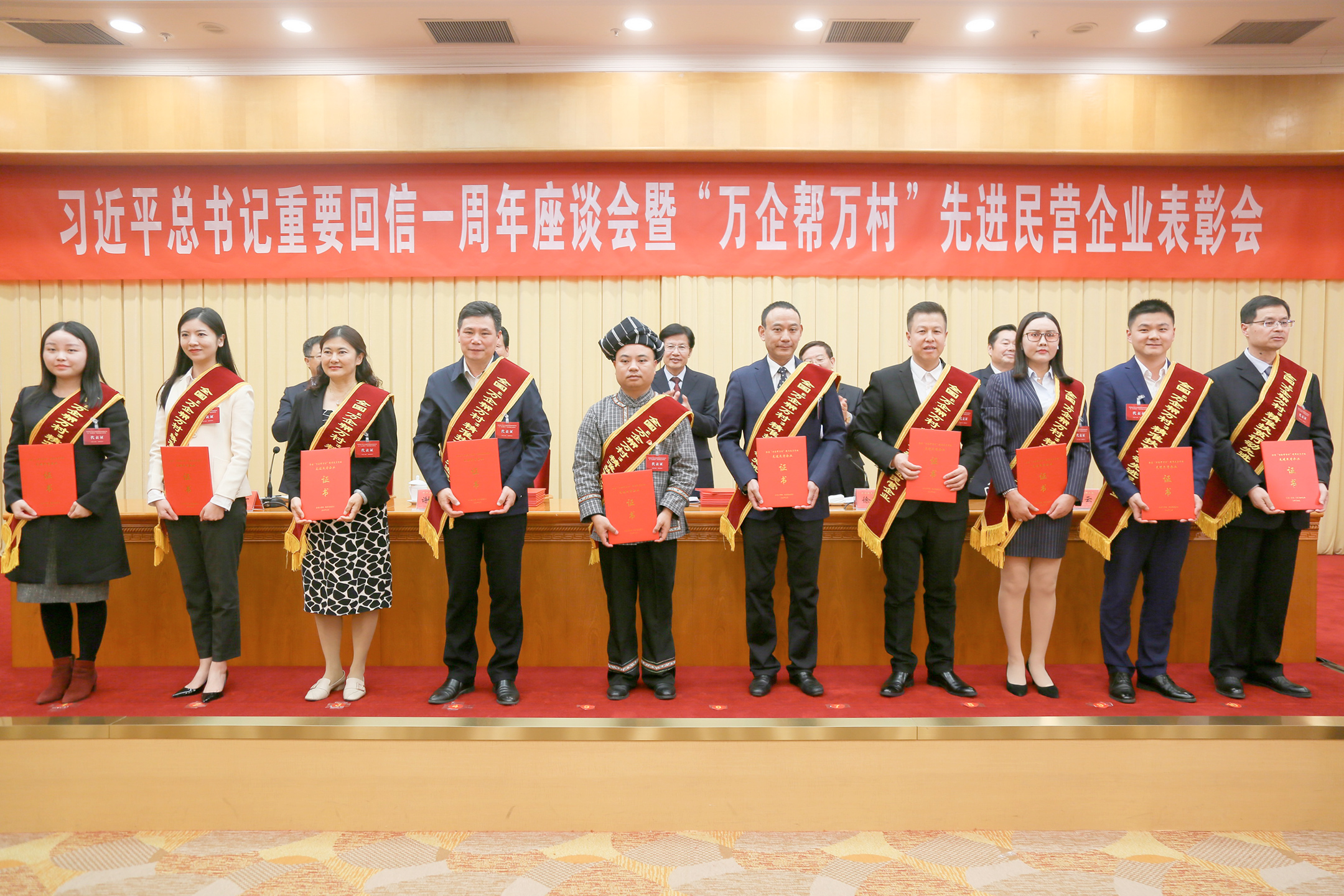 会前,中央政治局委员、国务院副总理胡春华接见“万企帮万村”精准扶贫行动先进民营企业代表并合影。