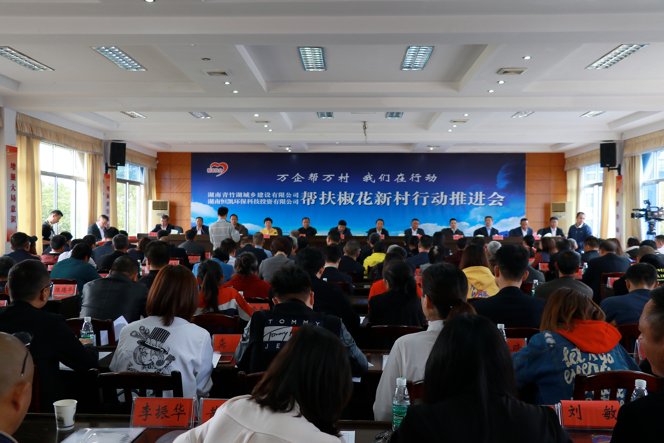 一年好景君须记,最是橙黄橘绿时。在这秋末冬初的时节,为贯彻落实习近平总书记关于脱贫攻坚工作的重要指示精神,高质量实现浏阳市达浒镇椒花新村脱贫目标,全力打赢打好脱贫攻坚战,11月17日,“万企帮万村”帮扶椒花新村行动推进大会在浏阳市达浒镇椒花新村隆重举行。长沙市人民政府副市长邱继兴、长沙市人民政府副秘书长王体泽,长沙市委统战部副部长、市工商联党组书记丁文,长沙市委外事办主任郑力虎,长沙市农业农村局党组成员、市委农办副主任周兴发,长沙市商务局党委委员、副局长孙春华,浏阳市人民政府副市长王坤球,浏阳市农业农村局党委委员、副局长瞿桂平,浏阳市达浒镇党委书记汪万江,湖南福天兴业投资集团股份有限公司董事长胡胜、湖南青竹湖城乡建设有限公司董事长胡准,湖南福天兴业投资集团党委书记、湖南恒凯环保科技投资有限公司总裁王巨涛,湖南青竹湖城乡建设有限公司总经理粟亿万出席了会议,参与“爱心结对”的80名企业高管与椒花新村40名群众代表参加了此次大会,浏阳市达浒镇党委副书记、镇长卢义胜主持会议。