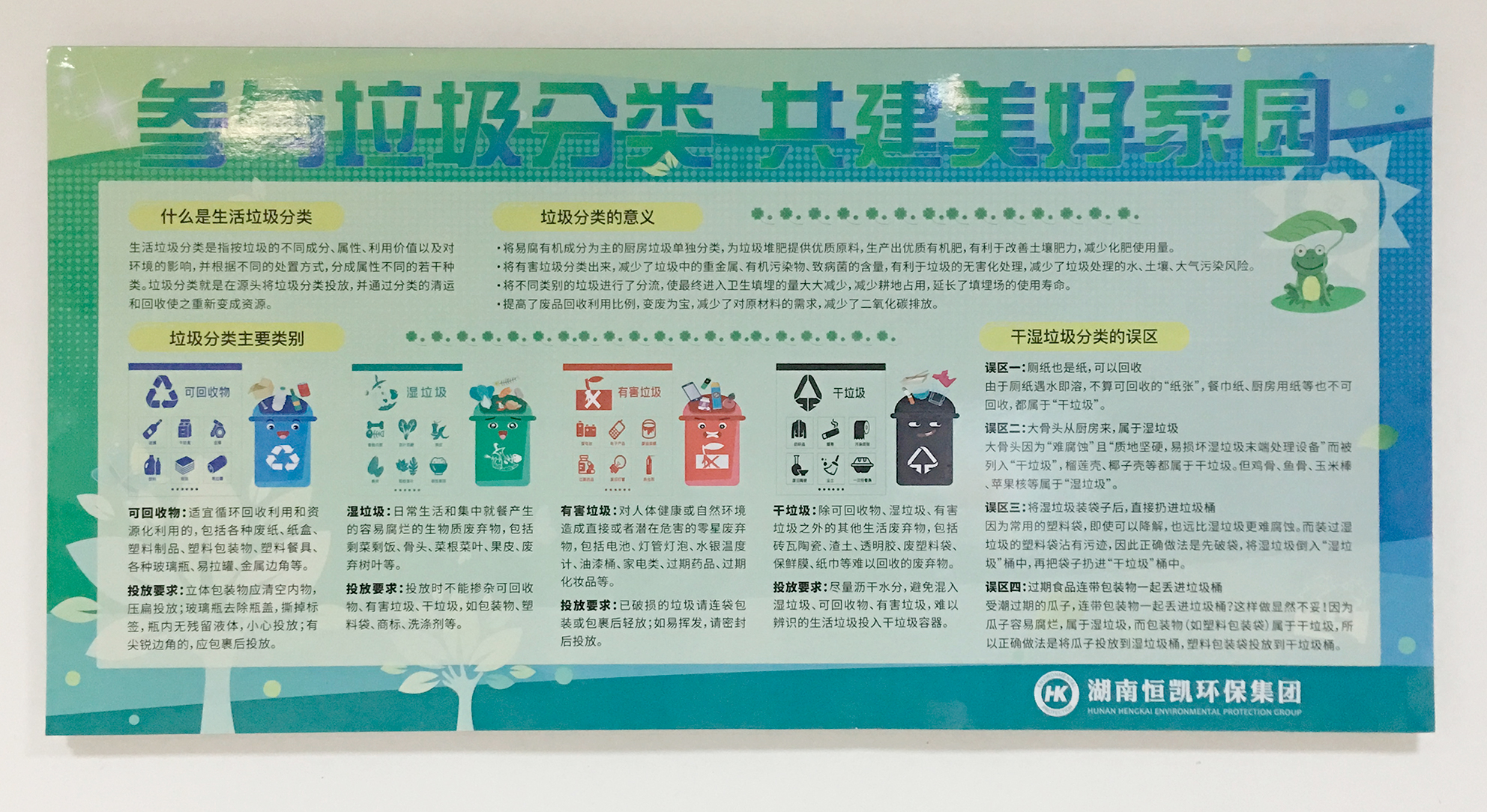 近年来,由于社会经济的快速发展和城市化进程不断加快,长沙高新区的生活垃圾已持续呈井喷式增长,垃圾分类已经势在必行。垃圾分类,从我做起。恒凯环保在此呼吁大家一起学会垃圾分类,积极参与到垃圾分类的行动中来,让垃圾分类从口号变为习惯,让我们一起为改善生活环境,共建绿色和谐家园而努力。