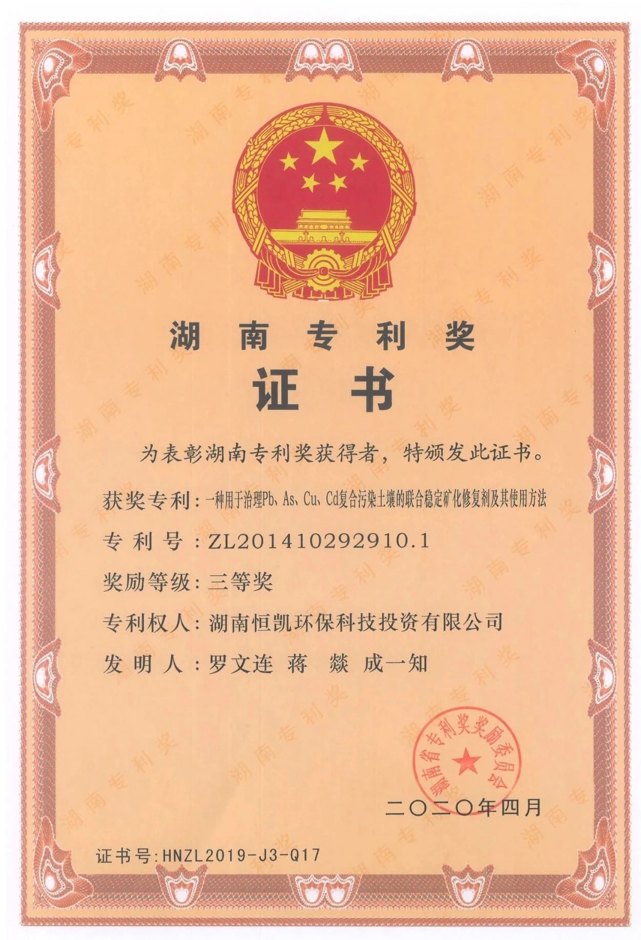 近日,在2020湖南知识产权宣传周启动仪式上,2019年度湖南专利奖揭晓,恒凯环保自主研发的发明专利“一种用于治理Pb、As、Cu、Cd复合污染土壤的联合稳定矿化修复剂及其使用方法”荣获湖南省专利三等奖。