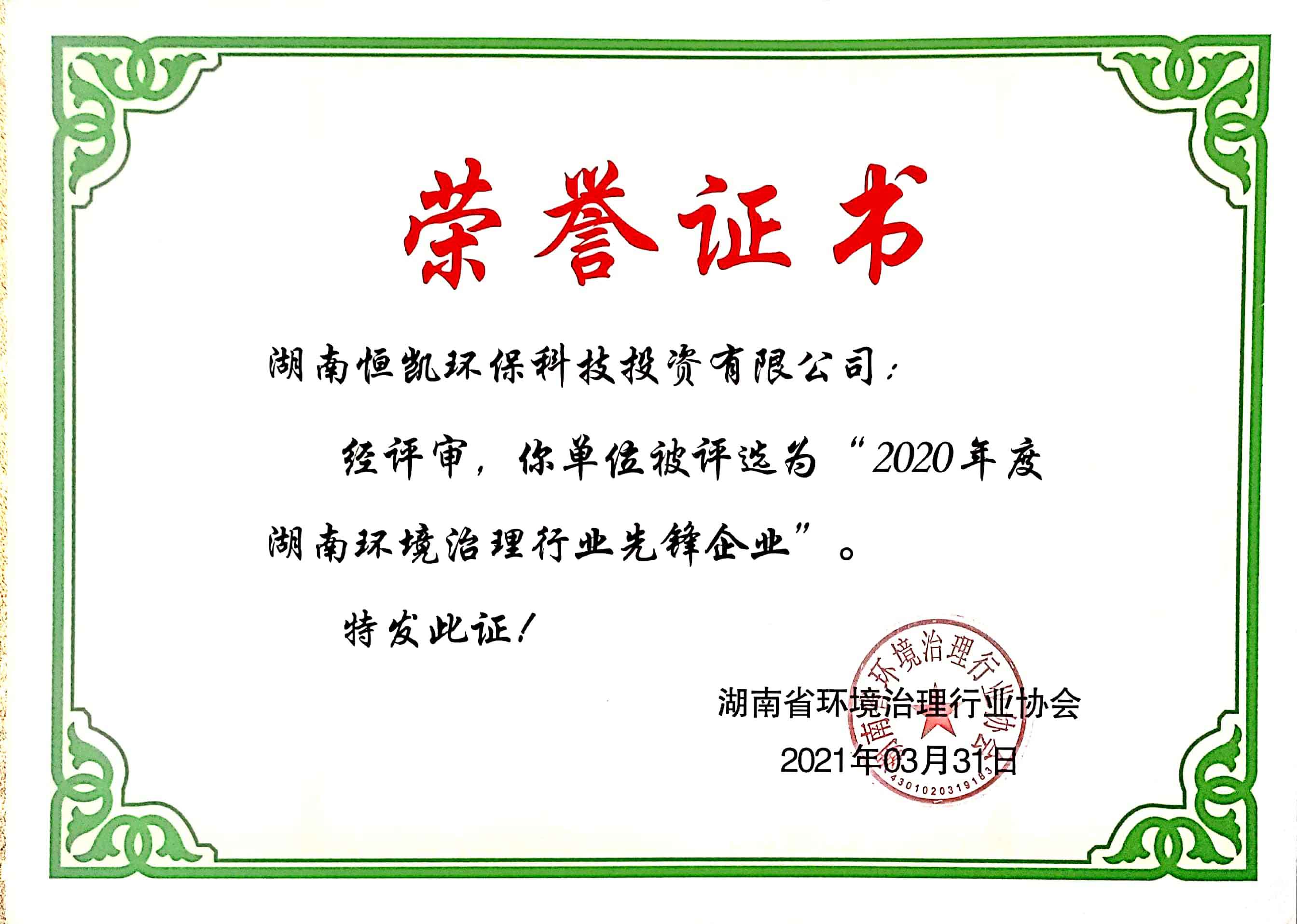 公司动态︱恒凯环保荣获2020年度湖南环境治理行业先锋企业