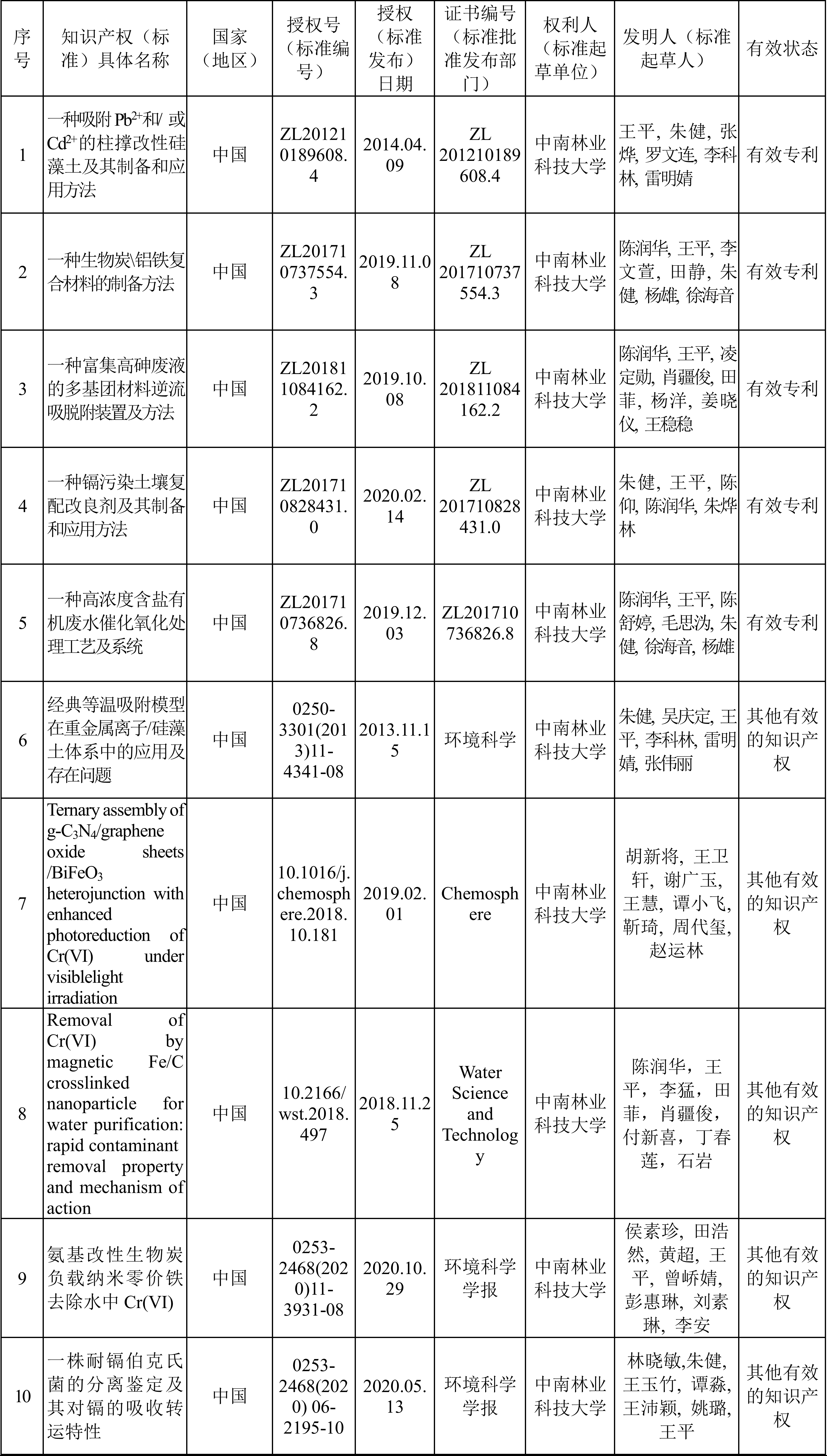 2、王平、朱健、陈润华拥有多项共同知识产权:(1)专利:一种生物炭\铝铁复合材料的制备方法;(2)专利:一种镉污染土壤复配改良剂及其制备和应用方法。